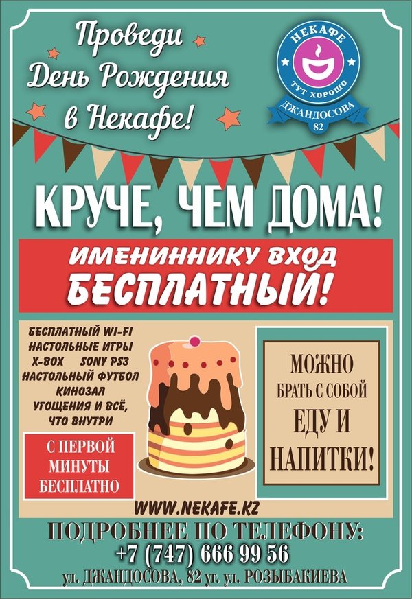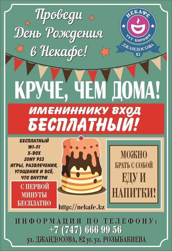 У тебя или у твоих друзей скоро ДЕНЬ РОЖДЕНИЯ? Не знаешь где отпраздновать? Ответ прост — Некафе на Джандосова! Каждый день мы дарим всем именинникам БЕСПЛАТНЫЙ ДЕНЬ! Также, именинник может отметить свой День Рождения в другой день (в течение недели) БЕСПЛАТНО, если приведёт с собой минимум 5-ых друзей! Оплата для друзей, как и всегда — только за время отдыха: 1 минута — 13 тенге, 1 час — 780 тенге, оплачиваете только за первые 5 часов, после 5-го часа БЕСПЛАТНО! — максимальный счёт 3900 тг на 1 человека! *Цены указаны на одного человека P.S.:… — Читать дальше