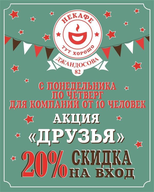 Друзья! Напоминаем вам: С понедельника по четверг (кроме праздничных дней) действует скидка -20% для компаний от 10 человек, которые приходят одновременно и осуществляют оплату сразу за 5 часов вперед. Вместо 3900 тг. на 1 человека, вы платите 3120 тг. на 1 человека. Наш сайт: nekafe.kz Наш адрес: ул. Джандосова 82, уг. ул. Розыбакиева (напротив автозаправки ГазПромНефть) Контактный номер: