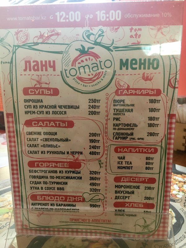 Меню сеть пицца-баров Tomato в Алмалинском районе