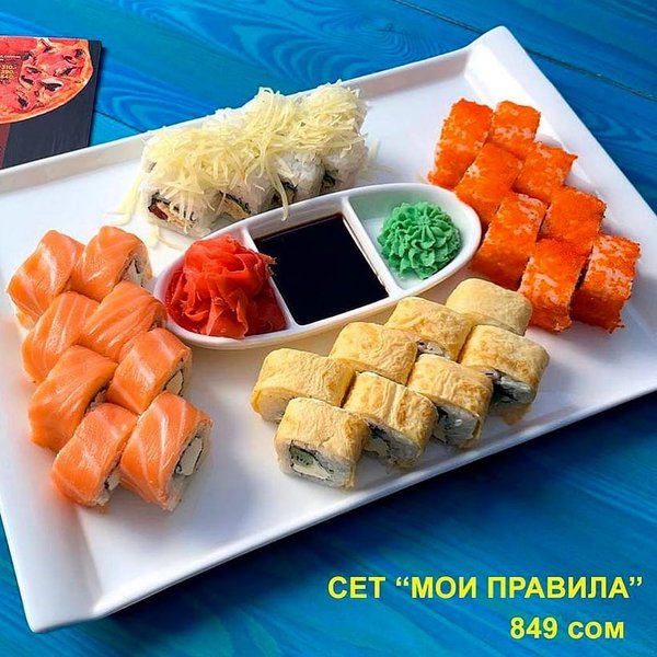 Бесплатная доставка по городу Сет » ФАВОРИТ» за 899 сом ————— Пицца 4 СЕЗОНА Филадельфия 8 штук Сэнсэй 8 штук Нами 8штук бесплатная доставка по городу 899 сом ——————