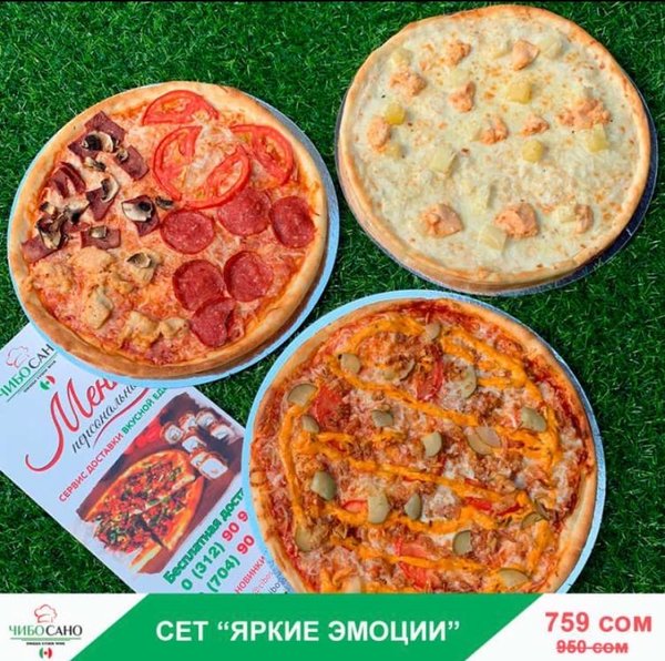 АКЦИЯ АКЦИЯ АКЦИЯ Бесплатная доставка по городу Сет » Яркие эмоции» за 759сом ————— Пицца 4 сезона 28 см Пицца Гавайская 28 см Пицца Чизбургер 28см бесплатная доставка по городу 759 сом —————— Ссылка для заказа онлайн в шапке профиля @cibosano.kg⤴️