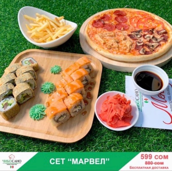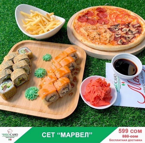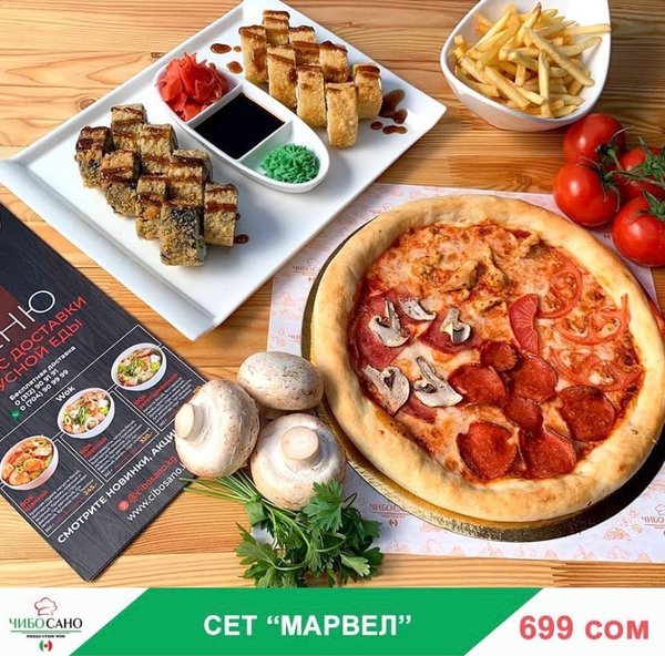 Бесплатная доставка по городу Вкусного ужина! Сет » Марвел» за 599 сом ————— Пицца 4 сезона Филадельфия Темпура 8 штук Вегетарианский 8 штук Фри бесплатная доставка по городу 599 сом —————— Оформить заказ можно любым удобным способом: ️по телефону ️на сайте ️через what’s app (0704909999) ️@cibosano.kg
