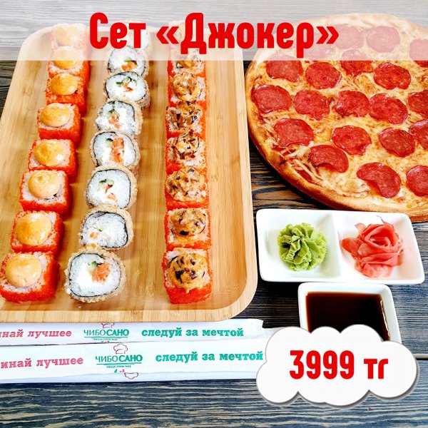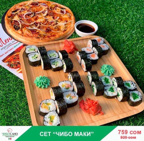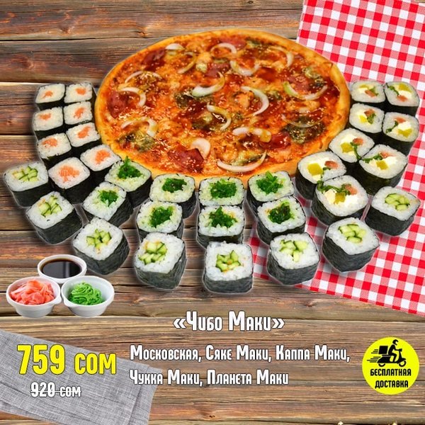 ВКУСНО! ВЫГОДНО!БЫСТРО! Бесплатная доставка по городу Сет » Чибо Маки за 759 сом ————— Пицца Московская 28см Каппа Маки 8 штук Сяке Маки 8 штук Планета Маки 8 штук Чукка Маки 8 штук бесплатная доставка по городу 759 сом —————— Ссылка для заказа онлайн в шапке профиля @cibosano.kg⤴️