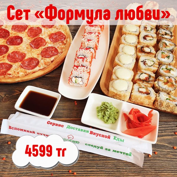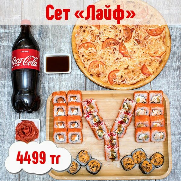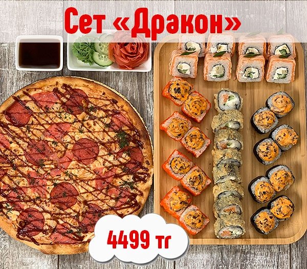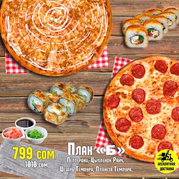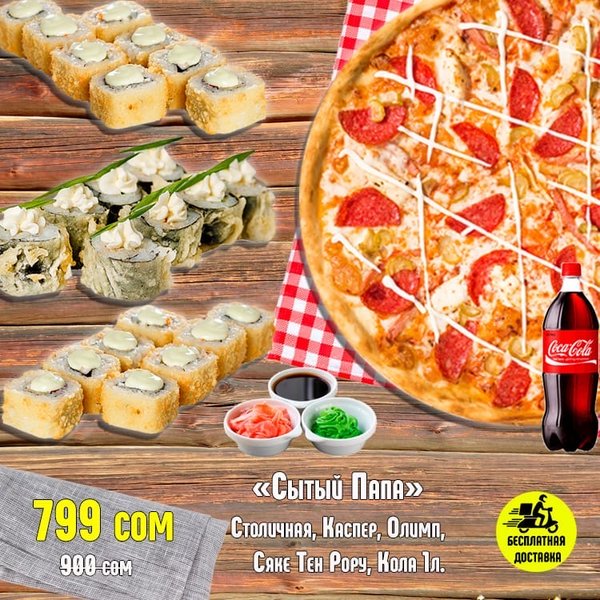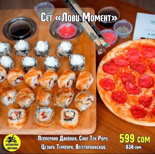 ВКУСНО! ВЫГОДНО!БЫСТРО! Бесплатная доставка по городу Сет » Лови момент» за 699 сом ————— Пицца Пепперони двойная Сяке Тен Рору 8 штук Цезарь Темпура 8 штук Вегетарианский 8 штук бесплатная доставка по городу 699 сом ——————
