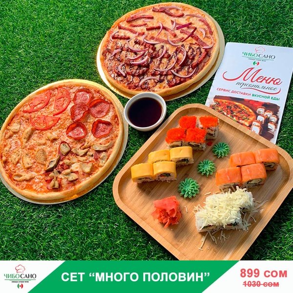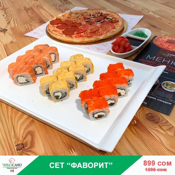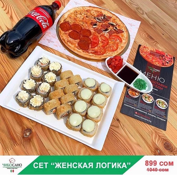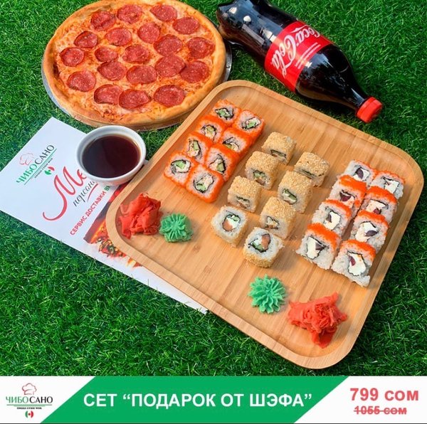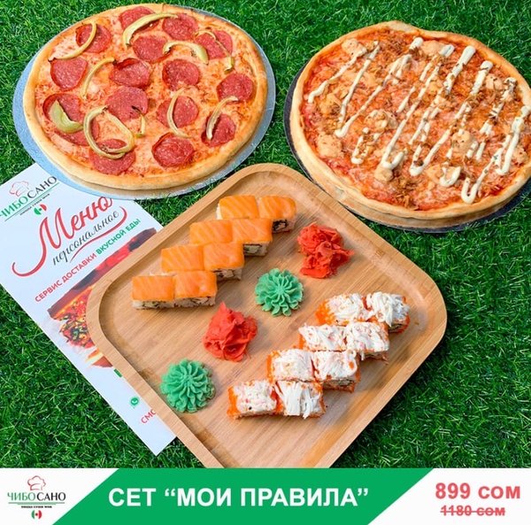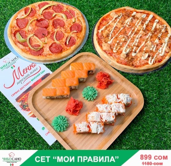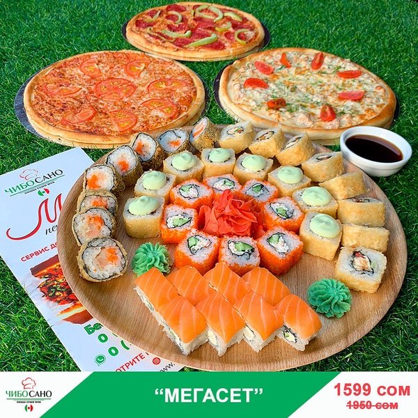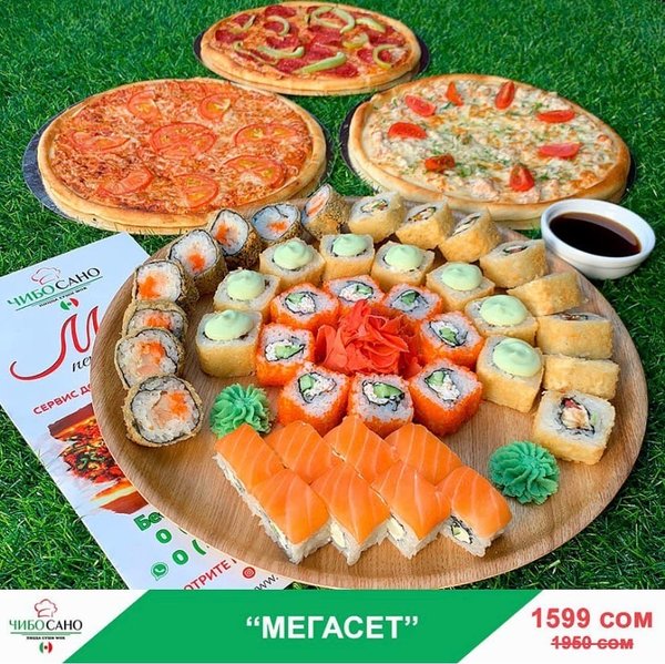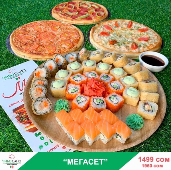 Бесплатная доставка по городу Начни свой день с Чибо Сано! Сет » МегаСет » за 1499сом ————— Пицца Пепперони с перцем 28см Пицца Маргарита 28см Пицца Крутая Цыпочка 28см Филадельфия Лайк 8штук Калифорния 8 штук Жареные роллы Цезарь Темпура 8 штук Мидзуми 8 штук Олимп 8 штук бесплатная доставка по городу 1499 сом —————— Ссылка для заказа онлайн в шапке профиля @cibosano.kg⤴️