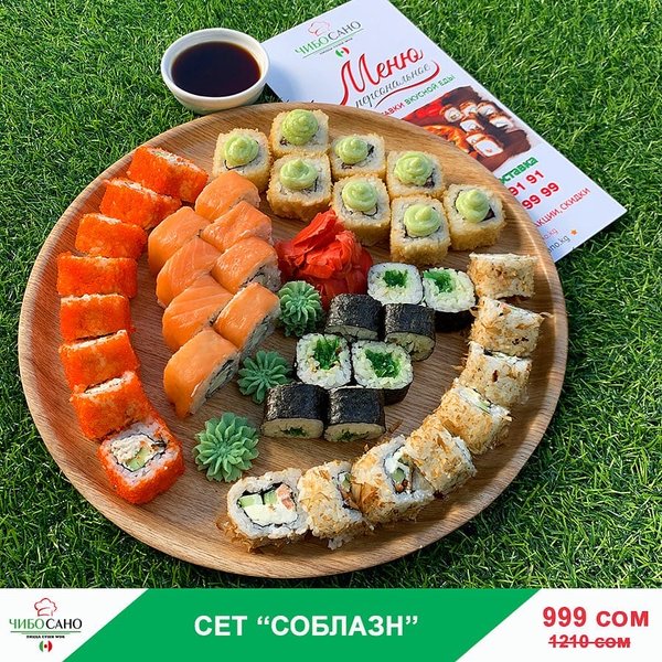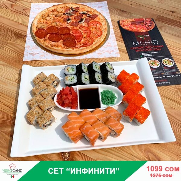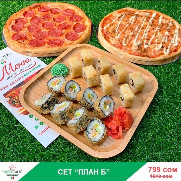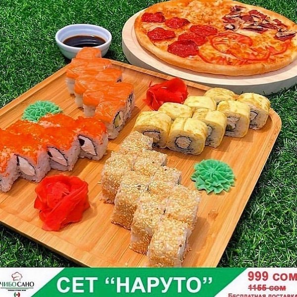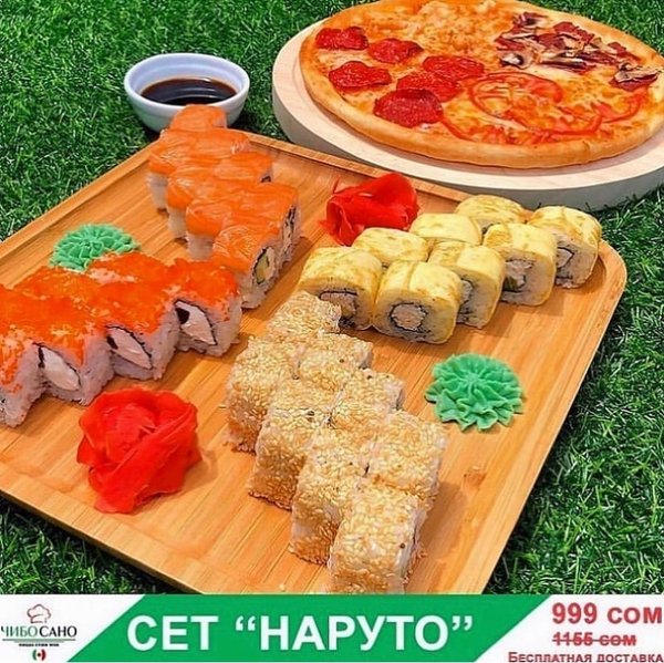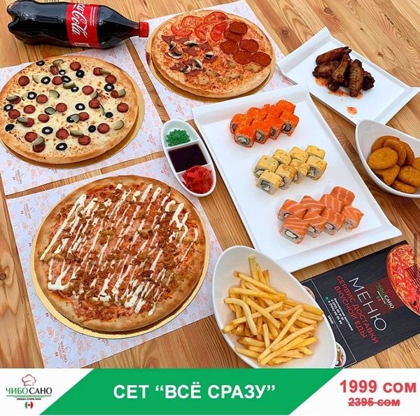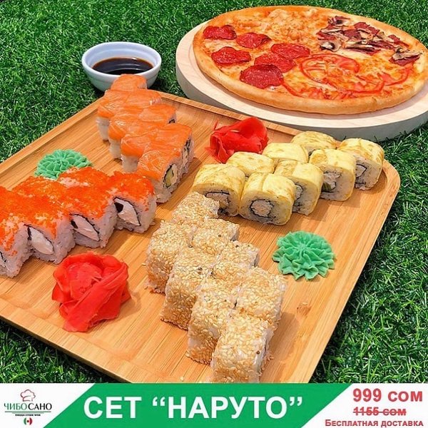 Бесплатная доставка по городу АКЦИЯ АКЦИЯ АКЦИЯ Сет «Наруто» за 899 сом ————— Пицца 4 сезона Филадельфия лайк 8 штук Судзуки Фила 8 штук Нежность 8 штук Кани тамаго 8 штук бесплатная доставка по городу 899 сом —————— Оформить заказ можно любым удобным способом: ️по телефону ️на сайте ️через what’s app (0704909999) ️@cibosano.kg