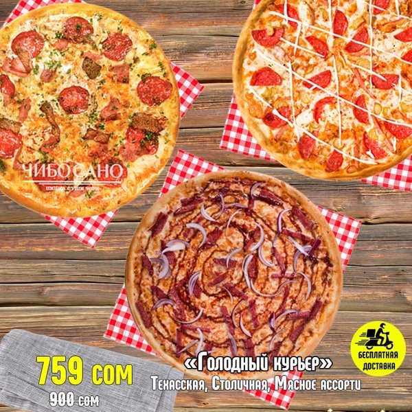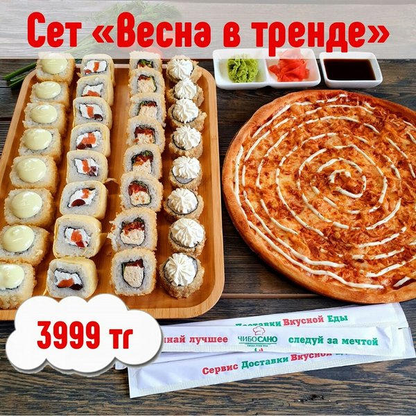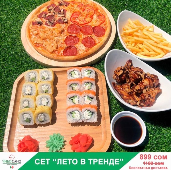 Бесплатная доставка по городу АКЦИЯ АКЦИЯ АКЦИЯ Сет » Лето в тренде» за 899сом —————- Пицца 4 Сезона Филадельфия лайк 8 штук кани тамаго 8 штук фри крылья барбекю бесплатная доставка по городу 899 сом ————————- Оформить заказ можно любым удобным способом: ️по телефону ️на сайте ️через what’s app (0704909999) ️@cibosano.kg