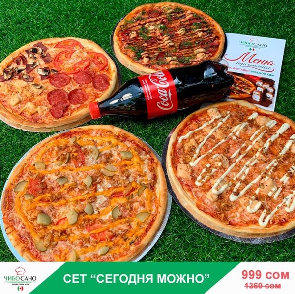 АКЦИЯ АКЦИЯ АКЦИЯ Бесплатная доставка по городу Сет » Сегодня можно» за 999 сом ————— Пицца 4 сезона 28см Пицца Барбекю 28см Пицца Цыплёнок Ранч 28см Бургер пицца 28см Кола 1 литр бесплатная доставка по городу 999 сом —————— Ссылка для заказа онлайн в шапке профиля @cibosano.kg⤴️