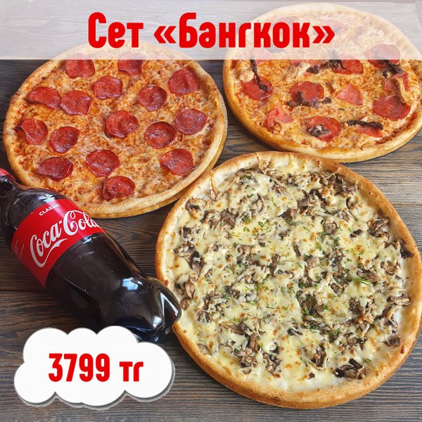 Вкусно, выгодно, быстро! ⠀ БАНГКОК ⠀ Пицца «Грибная» Пицца «Пепперони» Пицца «Мясное ассорти» Кола 1 л в подарок! . 3799 тг ⠀ Ссылка для заказа в шапке профиля⤴ @cibosano_kz ⠀ АЛМАТЫ