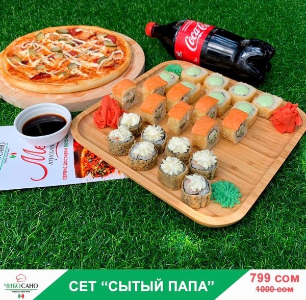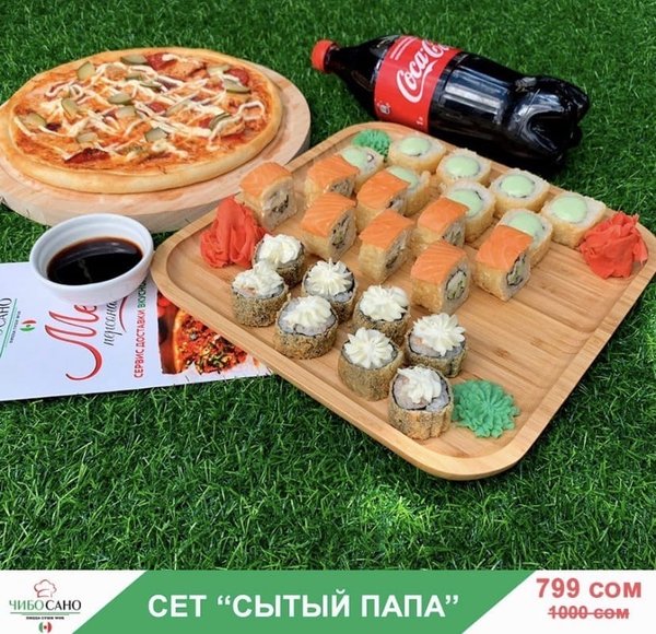 Бесплатная доставка по городу ВКУСНО! ВЫГОДНО!БЫСТРО! Сет » Сытый Папа» за 799 сом ————— Пицца Столичная Роллы Филадельфия Темпура 8 шт Сяке Тен Рору 8 шт Олимп 8 шт Кола 1 литр бесплатная доставка по городу 799 сом —————— Оформить заказ можно любым удобным способом: ️по телефону ️на сайте ️через what’s app (0704909999) ️@cibosano.kg