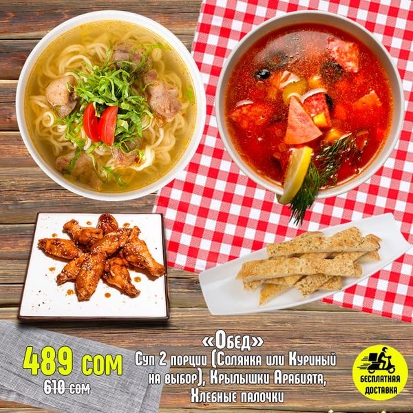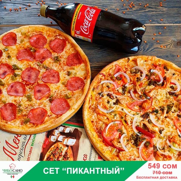 ВКУСНО! ВЫГОДНО!БЫСТРО! Бесплатная доставка по городу Сет » ОБЖОРКА » за 799 сом ————— Пицца Пепперони двойная Пицца Цыплёнок Ранч Пицца Крутая Цыпочка Кола 1л бесплатная доставка по городу 799 сом ——————