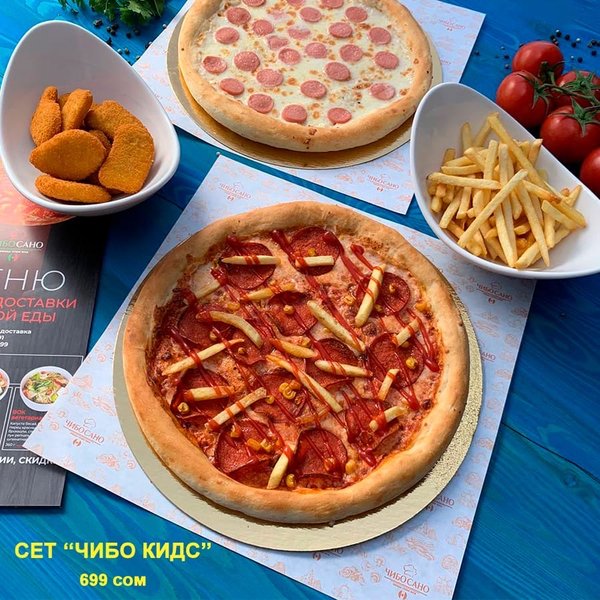 ВКУСНО! ВЫГОДНО!БЫСТРО! Бесплатная доставка по городу Сет » Чибо Кидс» за 699сом ————— Пицца Детская Пицца Джуниор Картофель Фри 1порция Наггетсы бесплатная доставка по городу 699 сом ——————