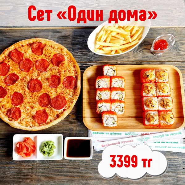 Новинка! ⠀ ОДИН ДОМА ⠀ Калифорния 8 шт Пицца «Пепперони» Дзен Хот 8 шт Фри . 3399 тг ⠀ Ссылка для заказа в шапке профиля⤴ @cibosano_kz ⠀ АЛМАТЫ