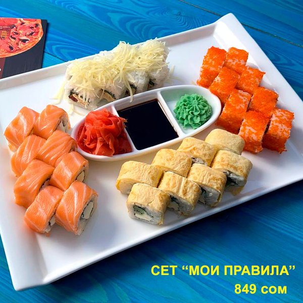 АКЦИЯ АКЦИЯ АКЦИЯ Бесплатная доставка по городу Сет » МОИ ПРАВИЛА » за 849 сом ————— Филадельфия 8 штук Калифорния 8 штук Нами 8 штук Цезарь 8 штук бесплатная доставка по городу 849 сом ——————