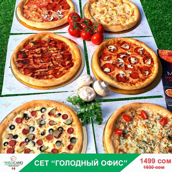 Закажи на вечер сейчас Бесплатная доставка по городу Сет » ГОЛОДНЫЙ ОФИС » за 1499 сом ————— Пицца Пепперони с грибами Пицца Фирменная Пицца Гавайская Пицца 4 Сезона Пицца Барбекю Пицца Крутая Цыпочка бесплатная доставка по городу 1499 сом ——————