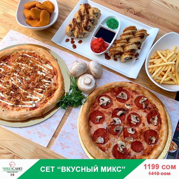 Закажи на вечер сейчас Бесплатная доставка по городу Сет » ВКУСНЫЙ МИКС » за 1199 сом ————— Пицца Пепперони с грибами Пицца Цыплёнок Ранч Горячий Лосось 8 штук Цезарь Темпура 8 штук Наггетсы Фри бесплатная доставка по городу 1199 сом ——————