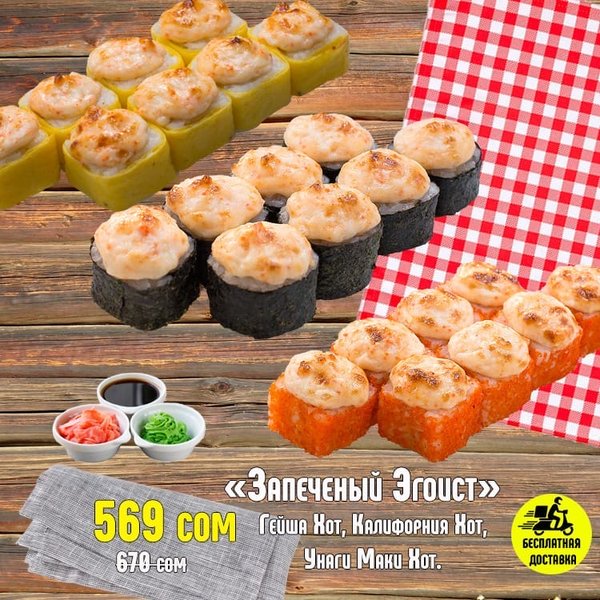 АКЦИЯ АКЦИЯ АКЦИЯ Бесплатная доставка по городу Сет «Запеченный эгоист» за 569 сом ————— Гейша Хот 8штук Калифорния Хот 8 штук Унаги Маки Хот 8 штук бесплатная доставка по городу 569сом —————— Ссылка для заказа онлайн в шапке профиля @cibosano.kg⤴️