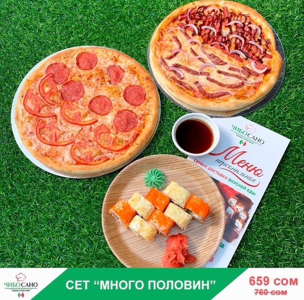 АКЦИЯ АКЦИЯ АКЦИЯ Бесплатная доставка по городу Сет » Много половин» за 659 сом ————— Половинки Пицц 28 см Пепперони+ Маргарита Карбонара+ Техасская Половинки роллов Калифорния Нами бесплатная доставка по городу 659сом —————— Ссылка для заказа онлайн в шапке профиля @cibosano.kg⤴️