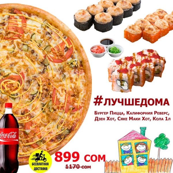 Закажи на вечер сейчас Бесплатная доставка по городу Сет » ВСЕ СРАЗУ » за 1999 сом ————— Пицца 4 сезона Пицца Фирменная Пицца Цыплёнок Ранч Филадельфия 8 штук Калифорния 8 штук Нами 8штук Наггетсы Фри Крылышки Арабията Кола 1литр бесплатная доставка по городу 1999 сом ——————