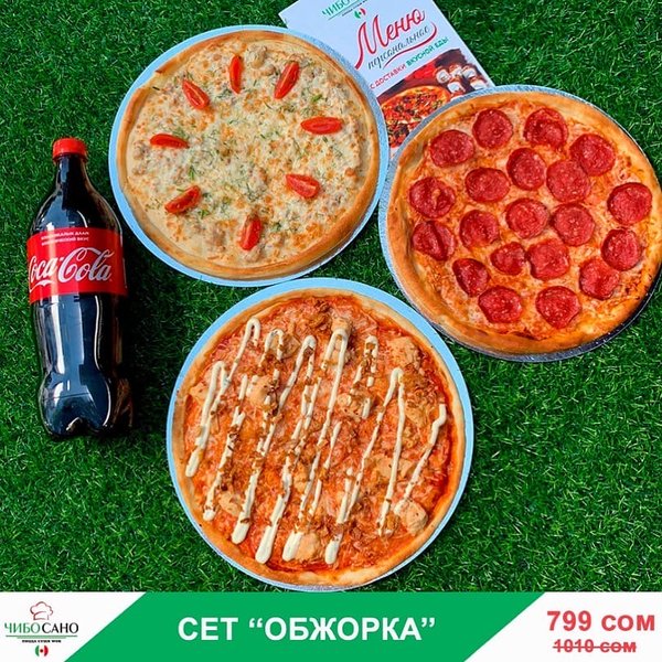 Бесплатная доставка по городу Начни свой день с Чибо Сано! Сет » ОБЖОРКА » за 799 сом ————— Пицца Пепперони двойная 28см Пицца Цыплёнок Ранч 28см Пицца Крутая Цыпочка 28см Кола 1л бесплатная доставка по городу 799 сом —————— Ссылка для заказа онлайн в шапке профиля @cibosano.kg⤴️