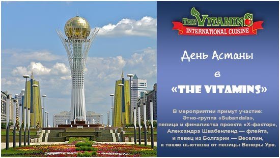 Дорогие друзья! 5 и 6 июля Арт-ресторан «The Vitamins» на летней террасе организовывает мероприятие, посвященное 15-летию столицы нашей Республики В мероприятии примут участие: Этно-группа «Subandala», певица и финалистка проекта «Х-фактор», Александра Швабенленд — флейта, и певец из Болгарии — Веселин, а также выставка от певицы и художницы Венеры Ура. Приглашаем Вас отпраздновать это событие вместе с нами и приятно провести этот вечер.