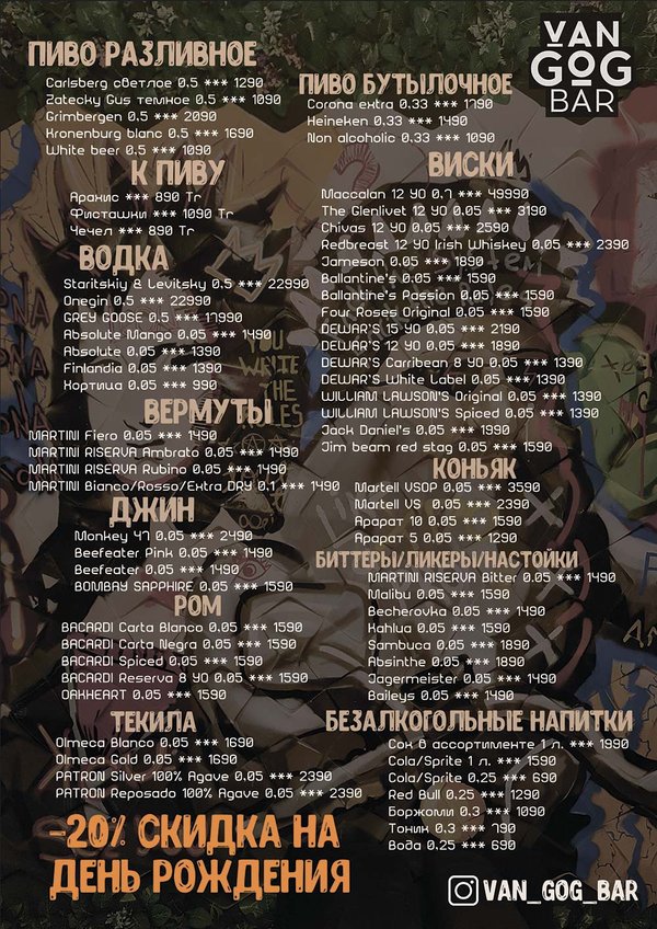 Актуальное меню на сегодняшний день VANGOG BAR ▫DJ играет каждый день ▫Караоке ▫20% СКИДКА на день рождения ▫20% Скидка на кухню до 17:00 ▫Welcome Drink ▫Crazy Bar cocktails ▫Шоу программы ▫Тематические вечера ▫Light 3500 до 17:00 ▫Hard 4500 до 17:00 ▪Адрес: Казыбек би 20 ▪ ▪
