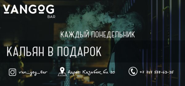 VANGOG BAR ▫DJ играет каждый день ▫Караоке ▫20% СКИДКА на день рождения ▫20% Скидка на кухню до 17:00 ▫Welcome Drink ▫Crazy Bar cocktails ▫Шоу программы ▫Тематические вечера ▫Light 3500 до 17:00 ▫Hard 4500 до 17:00 ▪Адрес: Казыбек би 20 ▪ ▪