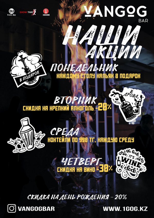 НАШИ АКЦИИ Пн — Подарок каждому столику. Вт — Скидка на крепкий алкоголь — 20% Ср — Коктейли по 990 Тг. Чт — Скидка на вино — 30% VANGOG BAR ▫DJ играет каждый день ▫Караоке ▫20% СКИДКА на день рождения ▫20% Скидка на кухню до 17:00 ▫Welcome Drink ▫Crazy Bar cocktails ▫Шоу программы ▫Тематические вечера ▫Light 3500 до 17:00 ▫Hard 4500 до 17:00 ▪Адрес: Казыбек би 20 ▪ ▪