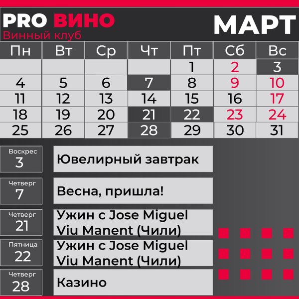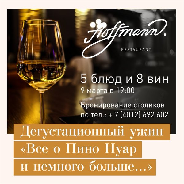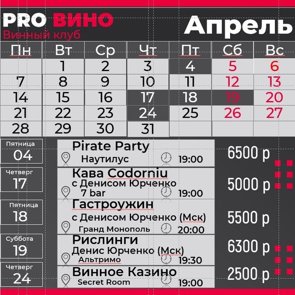 акусками и уникальными винами от Codorniu. Всего 12 мест, и каждое – это билет в мир нектара богов! Что ждет вас: ⦁ Уникальная возможность лично познакомиться с Денисом Юрченко и раскрыть его секреты мастерства. ⦁ Дегустация редких и уникальных вин, открывающих новые грани вкуса. ⦁ Профессиональные советы от победителя Московского и Балтийского кубков сомелье, обладателя Wine People Trophy, сертифицированного эксперта WSET 3 и CMS Certified III Level. Денис — преподаватель в знаменитых школах сомелье Fort Wine School, Enotria, Wine State. ⦁ Незабываемый вечер в окружении ценителей высокого класса. 18 апреля (пятница): Ужин на берегу Балтики Место: Ресторан Гранд Монополь, Зеленоградск Время: 20:00 Стоимость: 5500 рублей Позвольте себе окунуться в атмосферу Средиземноморья под руководством Дениса Юрченко. Наслаждайтесь изысканными блюдами на фоне завораживающих видов Балтики. Этот вечер станет настоящим кулинарным путешествием, где каждый аромат расскажет свою историю. 19 апреля (суббота): Рислинги на Куршской косе Место: Ресторан Альтримо Время: 19:30 Стоимость: 6300 рублей Погрузитесь в тонкости немецкого виноделия с дегустационным сетом из лучших Рислингов из разных субрегионов Германии. Этот вечер подарит вам изысканные вкусы и новые винные фавориты. 24 апреля (четверг): Винное Казино Винное казино возвращается! Место: Secret Room, Ленинский 7 Время: 19:00 Стоимость: 2500 рублей Приглашаем вас на захватывающее винное приключение в Secret Room — новое полотно и фишки – больше образцов + призы, фотосессия Подготовьтесь к вечеру, полному адреналина! Здесь ставки делаются вашими знаниями, а каждый бокал – это новая загадка. Что вас ждет: ⦁ Дегустация нескольких вин вслепую: испытайте свою интуицию. ⦁ Увлекательная игра с азартом и неожиданностями. ⦁ Возможность выиграть фантастические призы и, конечно, отличное настроение! Бронирование мест: []. Количество мест ограничено, успейте забронировать свое участие! Количество мест ограничено! Забронируйте ваше место за игровым столом и испытайте удачу среди винных экспертов!