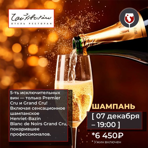 са, где каждый тон раскрывается с новой силой. Это шампанское — воплощение элегантности и утонченности, идеальное начало праздничного вечера. * Premier Cru Cheniers-les-Roses J.Lassalle Brut Préférence: Женственный и изысканный стиль шампанского дома, создающего вина с 1942 года, подарит вам невероятное ощущение легкости и очарования. * Marcel Menuau Millésimé Brut Blanc de Blancs Grand Cru: Созданное в тиши семейной винодельни (всего 15 000 бутылок!), это шампанское станет настоящим открытием. Ручная работа, невероятная забота о каждой детали, — чувствуйте исключительное качество каждого глотка. * Bonnet-Gilles-Mercier Précieux d'Ambouise Grand Cru Blanc de Blancs: Традиционный метод, дополненный уникальной техникой солера, — это шампанское, выдержанное на осадке 5 лет, поразит вас своей многогранностью и глубиной вкуса. * Henriet-Bazin Blanc de Noirs Grand Cru: Шампанское, созданное в гармонии с лунными циклами, — таинственное и чарующее, как сам праздник. Завершите первую неделю декабря неповторимым вкусом и праздничным настроением! Бронируйте места заранее! Стоимость ужина — 6450 р