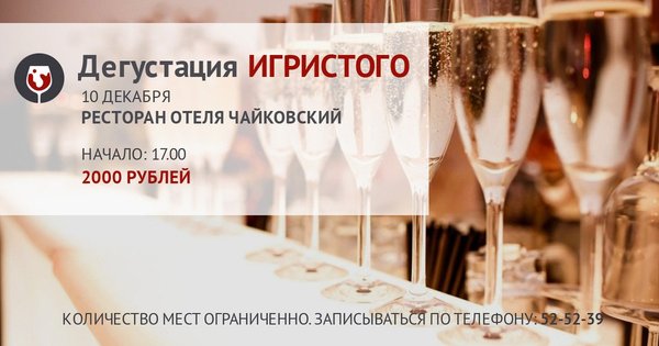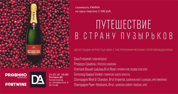 Зеландия) — абсолютный эксклюзив! Только в винном клубе Про Вино. Шампань Piper-Hidseck Brut Креман де Луар Bouvet Ladubay Сапфир Сомюр Брют Креман Д’Эльзас Lucien Albrecht. Rose Brut Просекко — Bisol Конельяно Вальдобьядене Просекко DOCG Каап Классик -Simonsig Kaapce Classik Кава Delapierre «Tradicion» Brut Кава — Freixenet Cava Cordon Rosado Асти — Pietro Laudano Вина будут поданы в сопровождении прекрасной кухни ресторана отеля Чайковский. Стоимость участия 2000 рублей. Бронирование мест: 52-52-39.