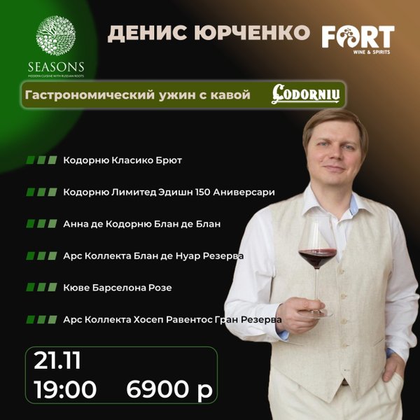 няшний день обещает быть насыщенным и продуктивным: Обучение официантов ресторана «Усадьба» по ассортименту виноторговой компании Fort. Денис проведёт эксклюзивный тренинг, который позволит ресторану предложить своим гостям только лучшие вино-гастрономические сочетания. Вечером состоится дегустация в Seven Champagne Bar, где в узком кругу мы попробуем лучшие образцы кавы Codorniu. Это уникальная возможность соприкоснуться с богатством вкуса и аромата легендарных напитков, услышать о тонкостях их производства и истории от настоящего мастера винного дела. Присоединяйтесь к нашему винному путешествию, чтобы открыть для себя новые горизонты вкуса и насладиться моментами, которые запомнятся надолго! Следите за новостями и новыми датами дегустаций. Мы уверены, что каждый сможет найти что-то особенное для себя!