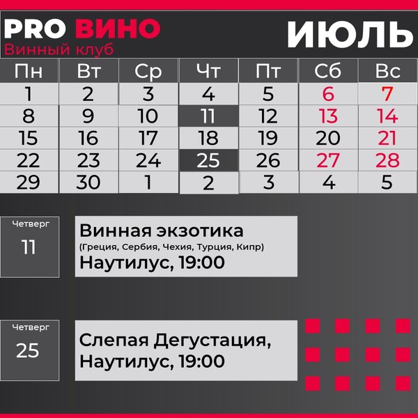 Про Вино (01.07.2024): Июльское расписание винных событий: 1. Необычное вино: Винная экзотика из Греции, Сербии, Чехии, Турции, Кипра. 11 июля в 19:00 Дегустация 9 (!!!) вин и блюд от шеф-повара обновленного ресторана «Наутилус» Стоимость 3900 ₽ Действительны подарочные сертификаты! 2. Слепая дегустация: 25 июля в 19:00 Дегустация 6 вин и блюд от шеф-повара ресторана «Наутилус» Стоимость 3500 ₽ Запись обязательна!