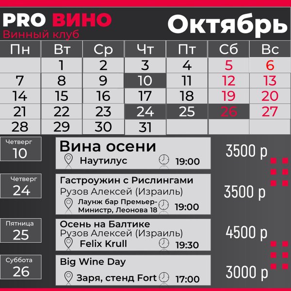 18 Время: 19:00 Стоимость: 3500 р 25.10 — «Осень на Балтике» (Рузов Алексей, Израиль): Гастроужин по осенним мотивам, где вы сравните Рислинги и Пино Нуары в разных стилях. Место: Фелкс Круль, Свтелогорск Время: 19:00 Стоимость: 4500 р 26.10 – фестиваль Big Wine Day Главная винная вечеринка этой осени! 7 столов от разных импортёров, более 200 позиций вин, круговая дегустация. Приходите на стенд компании Fort для личного общения и дегустации 12 образцов вин! Место: Заря Время: 17:00 Стоимость: 3000 р Не пропустите возможность окунуться в мир вина и насладиться вкусами осени! P.S. Все мероприятия Провино включают полноценную гастрономию: Не просто закуски, а продуманное меню, подчёркивающее вкус и аромат вина.