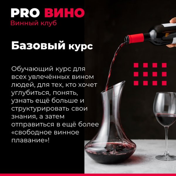 бы вы всегда делали удачный выбор! На курсе вы узнаете: * Как не прогадать с выбором вина в магазине или ресторане? * Какие вина стоит попробовать? * Как правильно читать этикетку и выбирать вино? * Где найти самые выгодные предложения? * Как хранить вино? * И многое другое! Стоимость курса: 34490 рублей 24900 рублей при оплате до 15 сентября Не упустите уникальную возможность погрузиться в мир вина! Запишитесь на курс уже сегодня! До встречи на ВИННОМ БАЗОВОМ КУРСЕ!