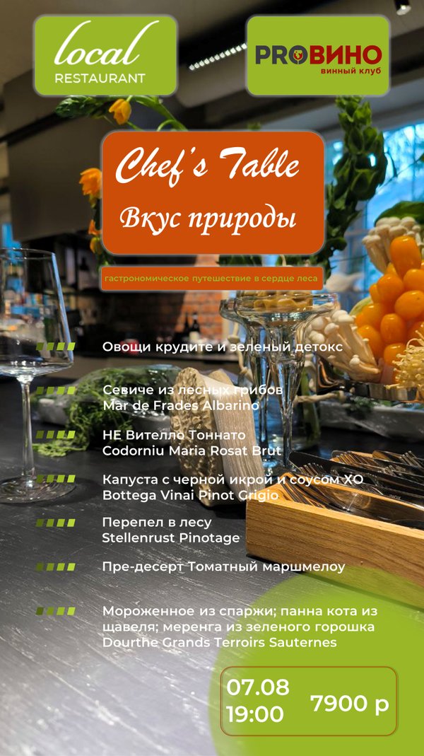 1. Овощи крудите и зеленый детокс: Пробуждение вкусовых рецепторов. 2. Севиче из лесных грибов: Нежный танец лесных даров, подчеркнутый свежестью Mar de Frades Albarino Rias Baixas DO. 3. НЕ Вителло Тоннато: Интригующая интерпретация классики в сопровождении игристого Codorniu Maria Rosat Brut. 4. Капуста с черной икрой и соусом ХО: Изысканное сочетание текстур и вкусов, дополненное Bottega Vinai Pinot Grigio Trentino DOC. 5. Перепел в лесу: Ароматный перепел, утопающий в богатстве лесных оттенков, в паре с насыщенным Stellenrust Pinotage. 6. Пре-десерт: Томатный маршмелоу – неожиданный аккорд, подготавливающий к сладкому финалу. 7. Десерт: Воздушная меренга из зеленого горошка, освежающая панна котта из щавеля и удивительное мороженное из спаржи – идеальная гармония, увенчанная сладким нектаром Dourthe Grands Terroirs Sauternes AOC. Каждое блюдо – это отдельная история, рассказанная языком вкуса и аромата. А идеальное винное сопровождение от сомелье Сергея Хмелевского, автора винного клуба Провино39, превращает ужин в настоящее искусство. Дата: 7 августа 2025 г. Время: 19:00 ⏰ Стоимость: 7900 рублей. Количество мест строго ограничено! ️ Забронируйте свой столик и отправьтесь в незабываемое гастрономическое путешествие! Restaurant Local baltic Телефон: Адрес: г. Светлогорск, ул. Гагарина, 15