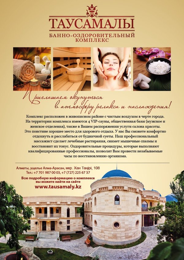 Мы открылись! Приглашаем вас посетить наш Банно-оздоровительный комплекс «Таусамалы». В нашем комплексе всегда к Вашим услугам: турецкий хамам, русская баня, VIP сауны, бассейн, общие банные отделения, семейные сауны, салон красоты, SPA, массажный центр и многое другое.