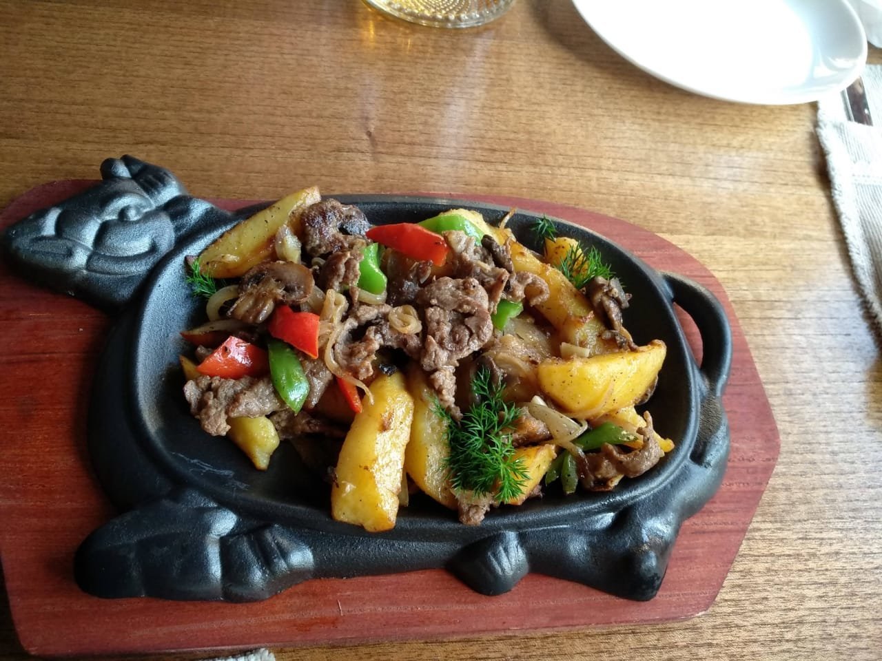 говядина, картофель, полугорький перец, грибы, лук, чеснок, специи