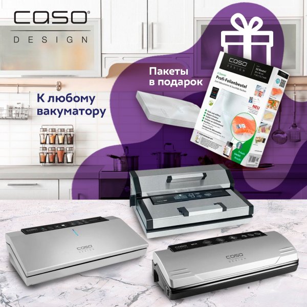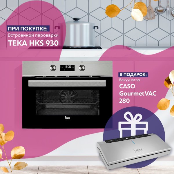 веющей стали, двойное стекло, 2 поддона для приготовления на пару, решетка, резервуар для воды 1,4 литра. Ну а мы позаботимся и о том, что останется от вкусного ужина — вакуумный упаковщик Caso VAC-280 сохранит еду свежей. Благодаря насосу мощностью в 130 Вт воздух откачивается со скоростью 15 литров в минуту, что позволяет качественно упаковывать продукты. Его можно использовать не только для этого, но и для упаковки мясной и сырной продукции, кондитерских и хлебобулочных изделий, жидких и порошкообразных продуктов, сухофруктов и другого. Продукты в вакуумных упаковках надежно защищаются от загрязнений и имеют презентабельный внешний вид. А откуда же он возьмется? Все просто — к каждой, купленной на сайте 1.kz пароварке TEKA HKS 930 мы его дарим! Спешите на сайт за заказом!