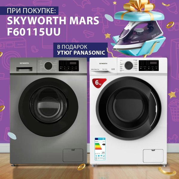 м для стиральных машин. Ее максимальная загрузка составляет 6 кг белья, а максимальная скорость отжима – 1 000 об/мин. Машина оснащена инверторным двигателем, который обеспечивает более тихую работу и меньшее энергопотребление. Внутренний бак из нержавеющей стали, что гарантирует долгий срок службы и устойчивость к коррозии. SKYWORTH Mars-15 F60115UU имеет простой и интуитивно понятный интерфейс управления, который позволяет быстро выбирать нужные программы и настраивать параметры стирки. Есть LCD-дисплей, на котором отображается информация о ходе программы и оставшемся времени до ее завершения. Стиральная машина SKYWORTH Mars-15 F60115UU является надежным и удобным устройством для стирки белья, обладает высокими техническими характеристиками и современным дизайном. Не забудьте снять распаковку или отметить нас в сториз — дарим скидку в 3000 тенге на следующий заказ, а за подробный обзор — лицензию Dr.Web!