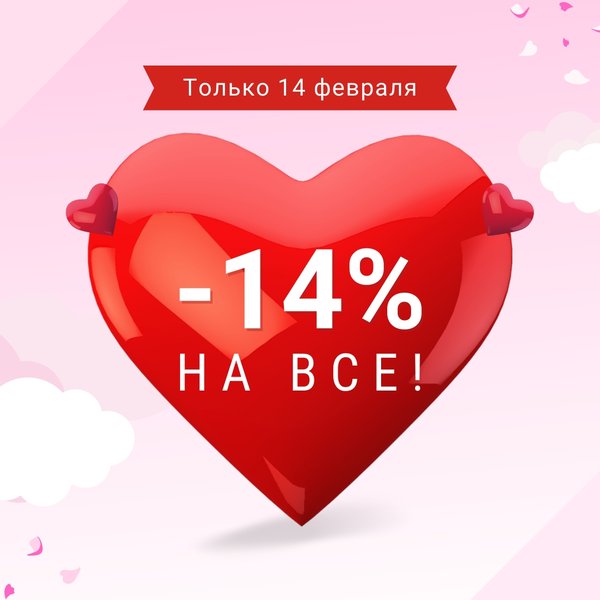 Какой подарок нужен на День Влюбленных? Любой найдется у нас! Только 14 февраля скидка на все 14%! Добавляй товары в корзину и не забудь ввести промокод LOVE! Почувствуй нашу любовь! Акция действует только при покупке через корзину сайта.