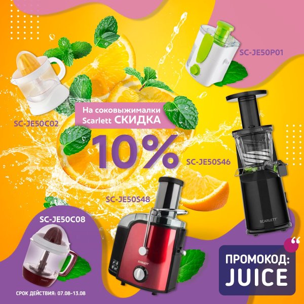 ать освежающие цитрусовые соки; SCARLETT SC-JE50P01 – универсальная модель для приготовления сока из различных фруктов и овощей; SCARLETT SC-JE50S48 – соковыжималка с инновационной системой фильтрации для чистого сока; SCARLETT SC-JE50C08 – стильная и функциональная соковыжималка для повседневного использования. Успейте воспользоваться акцией до 13 августа. Оформите заказ прямо сейчас на нашем сайте 1.kz и наслаждайтесь вкусными и полезными соками каждый день! Создавайте свой мир вкусов вместе со Scarlett.
