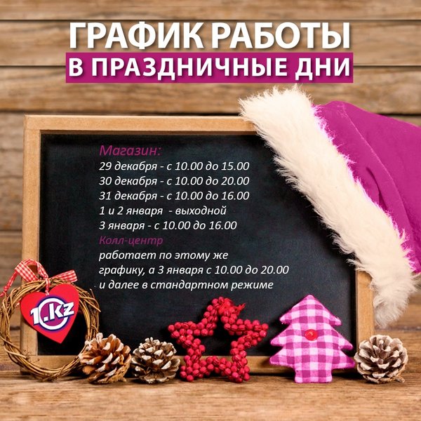 Уважаемые клиенты! Пожалуйста, ознакомьтесь с нашим режимом работы в праздничные дни! Магазин и колл-центр работают так: 29 декабря – с 10.00 до 15.00 30 декабря – с 10.00 до 20.00 31 декабря – с 10.00 до 16.00 1 и 2 января – выходной 3.01.23 – с 10.00 до 16.00, а колл-центр будет работать в обычном режиме до 20.00 С 4 января возвращаемся к обычному рабочему графику!