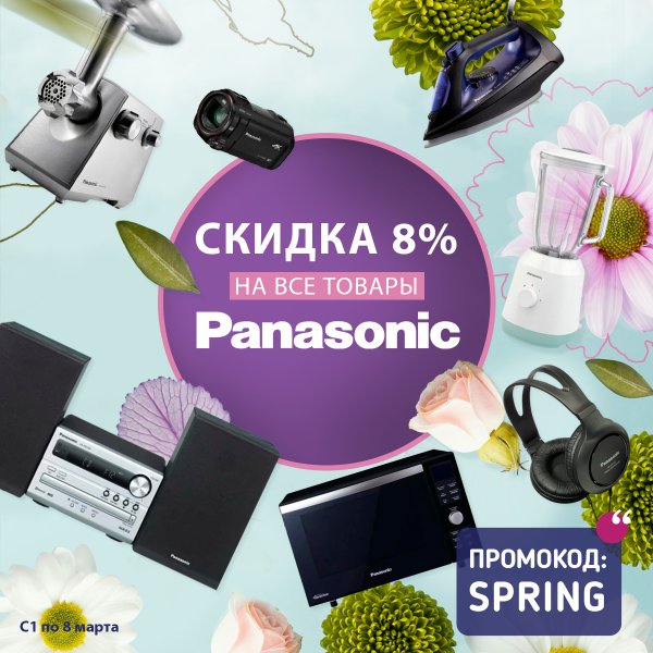авным образом акцентируя свое внимание на человеке и его жизни. Panasonic руководствуется инновационными технологиями при изготовлении своих электронных приборов. В 1986 году имя Panasonic начали использовать в качестве торговой марки и в Японии. В 2003 году представлен мировой бренд и девиз — «Panasonic. Ideas for life». Для обеспечения каждому клиенту комфортных условий жизни и реализации принципа «лучшая жизнь в лучшем мире» компания Panasonic упорно работает в разных сферах, обеспечивающих полноценную жизнедеятельность (дом, общество, бизнес, путешествия, автомобили). Компания Panasonic и 1.kz с удовольствием предлагает широкий ассортимент товаров: микроволновые печи, хлебопечи, видеокамеры, соковыжималки, блендеры, миксеры, наушники для любимой музыки, триммеры. Пусть ваши покупки станут ещё приятнее с промокодом SPRING с 1 по 8 марта!