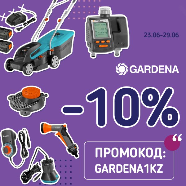 ы, которые сделают уход за садом легким и приятным занятием. В 1973 году GARDENA представила свою первую революционную разработку – систему быстрого соединения для садового шланга. Это позволило садоводам легко подсоединять и отсоединять шланги, без необходимости использовать инструменты. Этот продукт сразу стал хитом продаж. В 1987 году GARDENA представила свою первую систему автоматического полива сада. Теперь садоводы могли наслаждаться своими зелеными оазисами, не тратя время и усилия на ручной полив. В 2005 году GARDENA удивила мир своими интеллектуальными роботами-газонокосилками. Эти автономные устройства могли самостоятельно обслуживать газоны, обеспечивая идеально стриженный газон без необходимости участия садовода. В 2020 году GARDENA сделала еще один шаг вперёд, представив садовые инструменты, которые можно подключить и управлять ими через мобильное приложение. Теперь можно поливать растения, включать системы освещения и следить за состоянием сада прямо с вашего смартфона. В этом году GARDENA отмечает целых 62 года в садоводстве! По этому случаю (и не только) мы предлагаем скидку в 10% на все продукты GARDENA. Используйте промокод GARDENA1KZ при оформлении заказа на сайте 1.kz с 23 по 29 июня и получите отличное качество и надежность GARDENA по приятной цене.