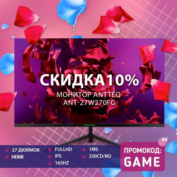 рах. Ответственно заявляем, что хороший игровой монитор должен быть быстрым, а AntTeq ANT-27W270FG как раз такой. На этом приятные новости не заканчиваются, потому что на AntTeq ANT-27W270FG вы получаете скидку в 10% по промокоду GAME! Самое время начать играть по-новому!