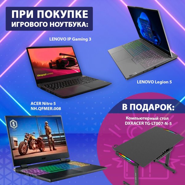 ит невероятно реалистичную графику, а твердотельный накопитель ёмкостью 512 ГБ позволит быстро запускать игры и загружать систему. LENOVO IP Gaming 3 (82K201RHRU) – надёжный партнер для виртуальных сражений. Он оснащен процессором AMD Ryzen 7, графикой NVIDIA GeForce GTX и 8 ГБ оперативной памяти, этот ноутбук гарантирует плавный игровой опыт даже в самых интенсивных сценах. Храните всё самое важное на большом жестком диске емкостью 1 ТБ, и наслаждайтесь идеальной комбинацией производительности и пространства для хранения. LENOVO Legion 5 (82RB00ERRK) – непревзойденная мощь для истинных геймеров. Внутри процессор AMD Ryzen 9, графика NVIDIA GeForce RTX и 16 ГБ оперативной памяти, этот ноутбук позволит вам в полной мере погрузиться в игровой мир. Отлично сбалансированный, Legion 5 обеспечит восокую производительность в самых требовательных играх и гарантированно станет вашим верным спутником. Твоё игровое пространство теперь будет на высшем уровне, ведь мы дарим тебе не просто стол, а DXRACER – мирового лидера в производстве игровой мебели. Этот стол станет идеальным спутником для твоего игрового ноутбука, обеспечивая комфорт и поддержку, которые так необходимы во время долгих игровых сессий. Успей приобрести свой идеальный игровой ноутбук и получи невероятный подарок – компьютерный стол DXRACER TG-LT007-N-5. Наслаждайся процессом игры, не беспокоясь о мелочах, ведь DXRACER позаботится о твоем комфорте и эффективности в игре. Не забудьте снять распаковку или отметить нас в сториз — дарим скидку в 3 000 тенге на следующий заказ!