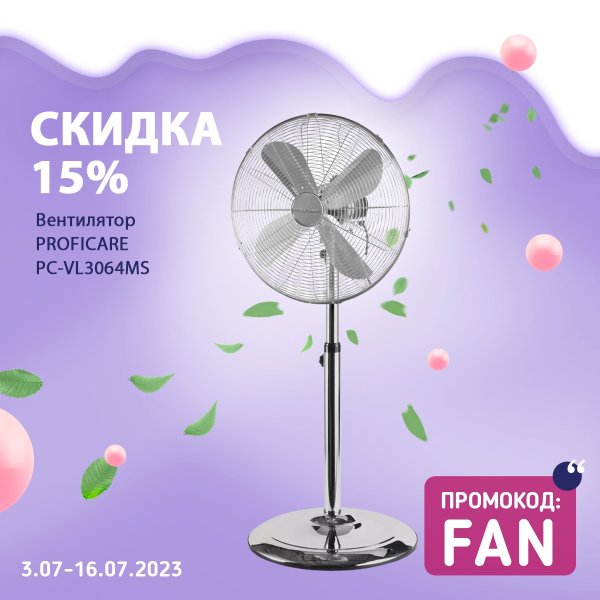 нтилятор под свои предпочтения. Выбирайте мягкий режим для приятного и непрерывного потока воздуха, или активный режим для более интенсивного охлаждения. Простое управление с помощью пульта дистанционного управления или интуитивной панели управления на самом вентиляторе просто и удобно. Независимо от того, находитесь ли вы дома или в офисе, вентилятор PROFICARE PC-VL3064MS обеспечит вас надежным и бесшумным охлаждением. А благодаря своей элегантной и компактной конструкции он легко впишется в любой интерьер. Оформляйте заказ на вентилятор PROFICARE PC-VL3064MS со скидкой 15% по промокоду FAN с 3 по 16 июля, создавайте идеальный микроклимат и наслаждайтесь уютом и свежестью в жаркие летние дни. Предложение ограничено.