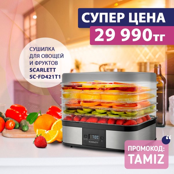 огий Теперь вы сможете легко и просто высушить свежие ягоды, овощи, фрукты и травы. Емкость для сушки вмещает до 5 лотков с продуктами, а интуитивно понятный пульт управления позволяет настроить время и температуру процесса под ваши желания. Супер-цена с промокодом TAMIZ: 29 990 тг! Воспользуйтесь промокодом TAMIZ при покупке сушилки SCARLETT SC-FD421T19 и получите ее по выгодной цене – 29 990 тг. Внесите больше пользы в свою жизнь и порадуйте себя и своих близких. Подарок гурманам SCARLETT SC-FD421T19 – это отличный подарок для любителей гастрономических изысков, заботы о здоровье и креативных кулинаров. Подарите радость и вдохновение, пусть родные и друзья создадут свои неповторимые деликатесы лёгким движением руки! Не упустите возможность оформить заказ на сушилку для овощей и фруктов SCARLETT SC-FD421T19 по супер цене 29 990 тг с промокодом TAMIZ. Начните наслаждаться вкусами натуральных и полезных лакомств каждый день. Не забудьте снять распаковку или отметить нас в сториз — дарим скидку в 3 000 тенге на следующий заказ!