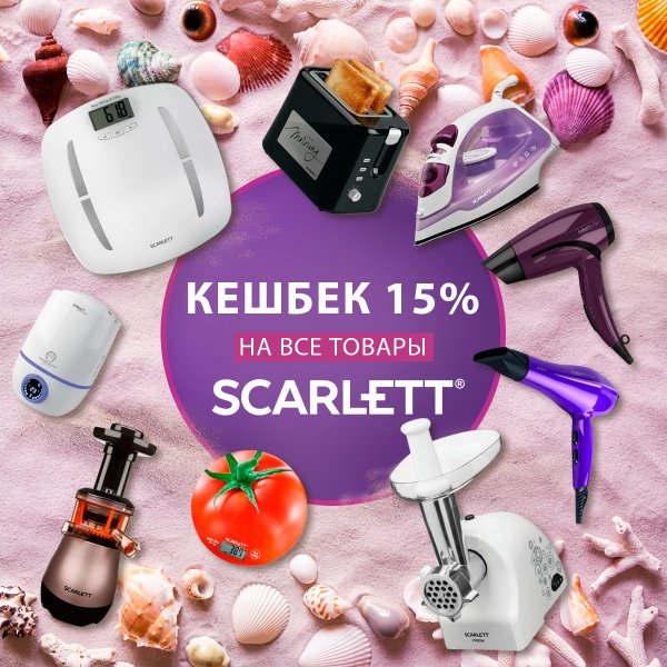 омощников, которые легко и просто справятся с повседневными задачами. От мощных мультиварок и электрических чайников до интеллектуальных пылесосов и современных миксеров – SCARLETT предлагает всё, что нужно для комфортной жизни. Каждое изделие SCARLETT проходит строгий контроль качества. Бренд использует только высококачественные материалы, чтобы обеспечить надёжность и долговечность продукции. Вы можете быть уверены, что с SCARLETT вы получаете продукцию, которая прослужит вам долгие годы. Не откладывайте на потом – обновите свой дом с помощью продукции SCARLETT уже сегодня. А кешбек 15% на все товары SCARLETT пусть порадует вас дополнительно.